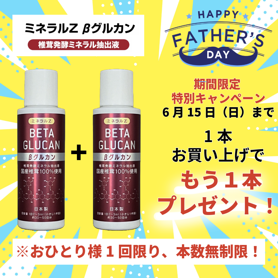 6月15日の父の日を記念して、ミネラルZ βグルカンでは「ご家族と一緒に始める健康生活」のために、1本お買い上げの方にもう1本プレゼントする期間限定キャンペーンを行います(※おひとり様1回限り)。